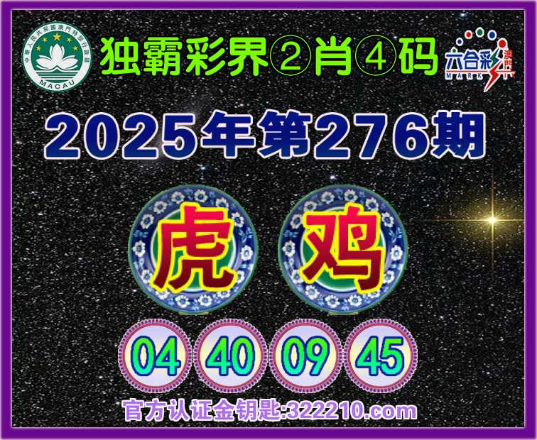 276期:〖独霸彩界〗 🏇②肖④码🏇【虎】【04.40.09.45】开:鸡09